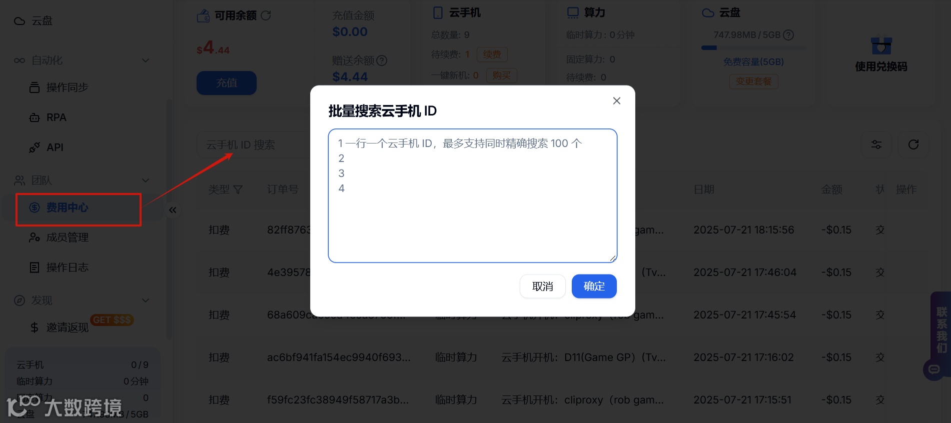 DuoPlus云手机用户在费用中心可以通过批量搜索云手机ID,快速查找对应云手机的使用支出情况,有助于把控使用成本。