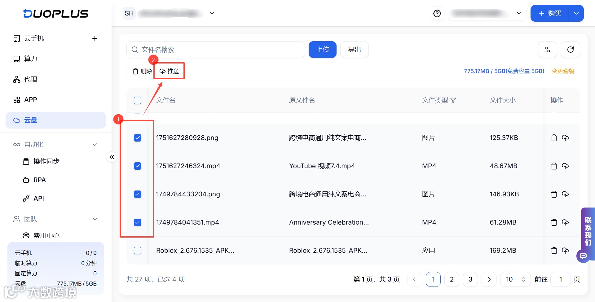 DuoPlus云手机结合用户需求,新增云盘文件批量推送功能。用户在云盘空间勾选多个文件后,点击推送按钮,再选择要接收文件的云手机即可,一键推送多个文件更省时省心!