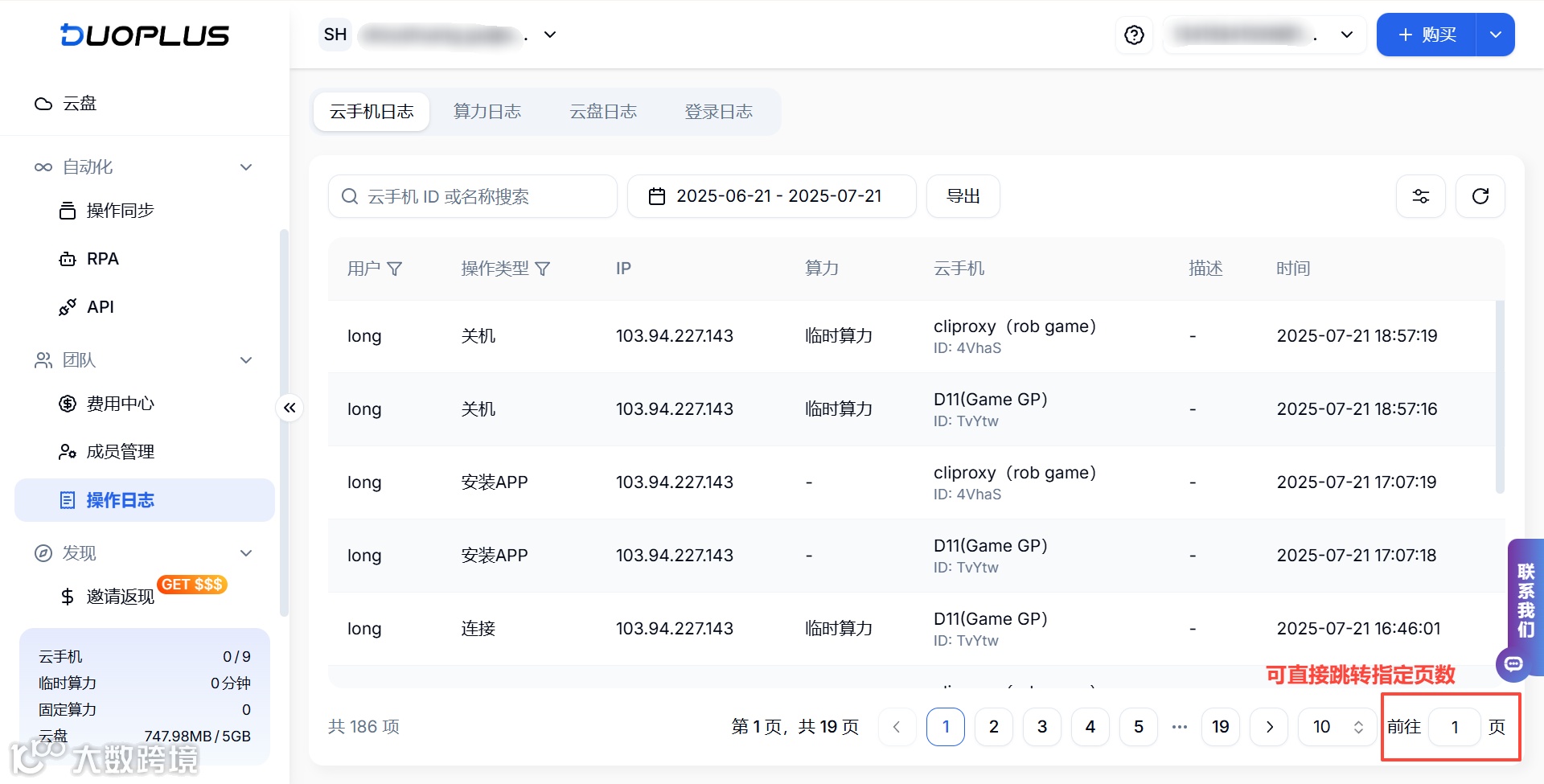 DuoPlus云手机结合用户需求,优化了所有列表的页面跳转功能,用户可以直接输入指定页码,一键跳转,减少翻页操作。
