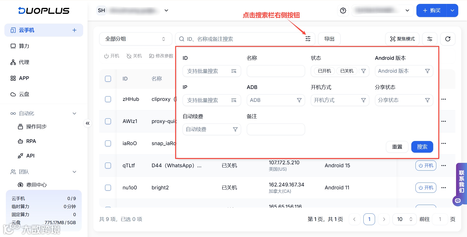 - 云手机列表搜索功能优化:支持设置多个条件进行搜索云手机,查找云机更精准