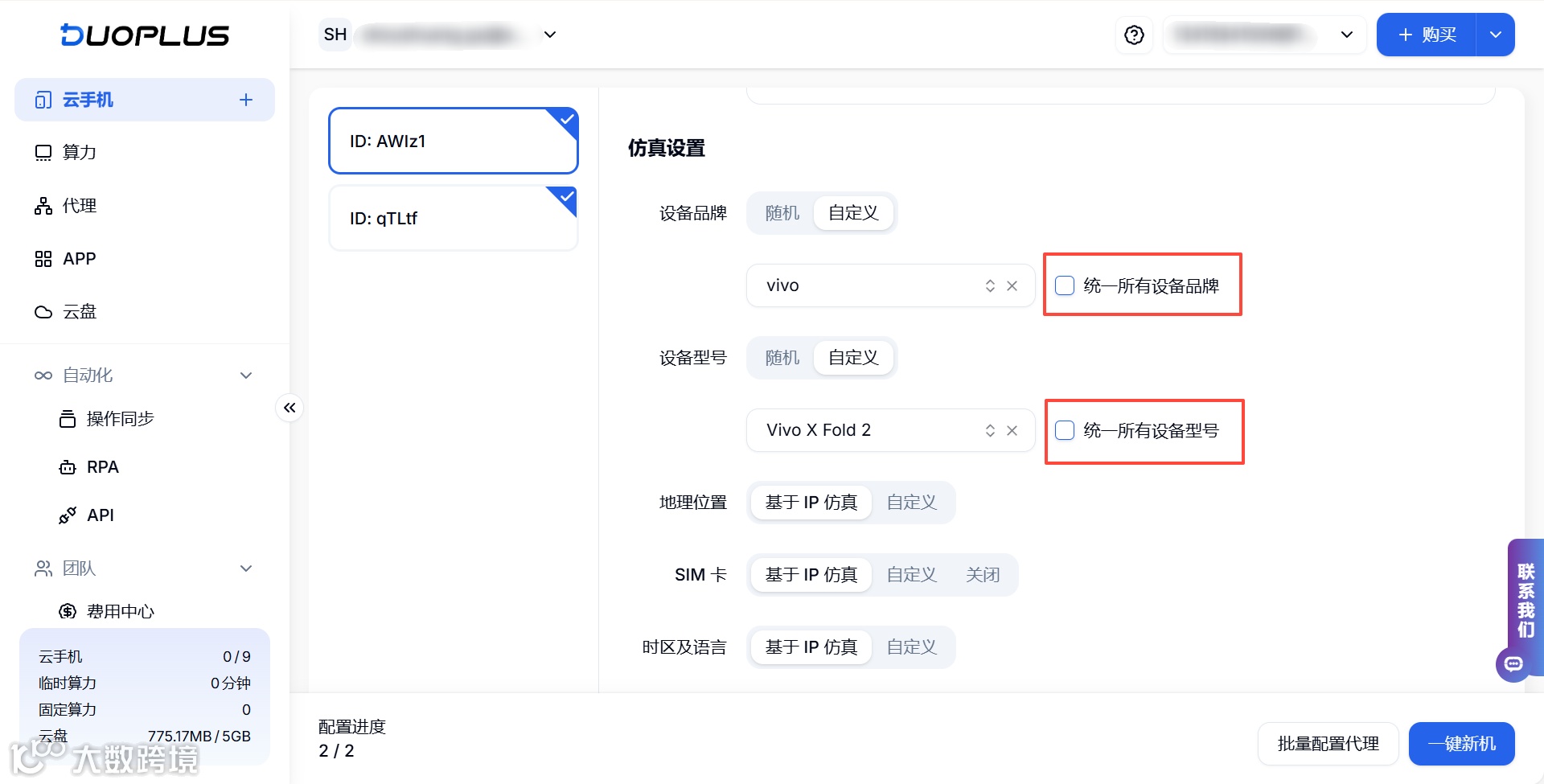 - 支持统一配置品牌型号:用户在一键新机/批量初始化代理时可以直接统一云手机的品牌、型号