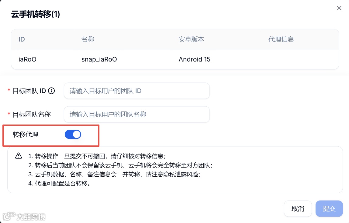 DuoPlus用户向其他团队转移云手机时,通过【转移代理】的开关按钮,可以选择是否转移该云机的代理信息,操作更灵活安全。