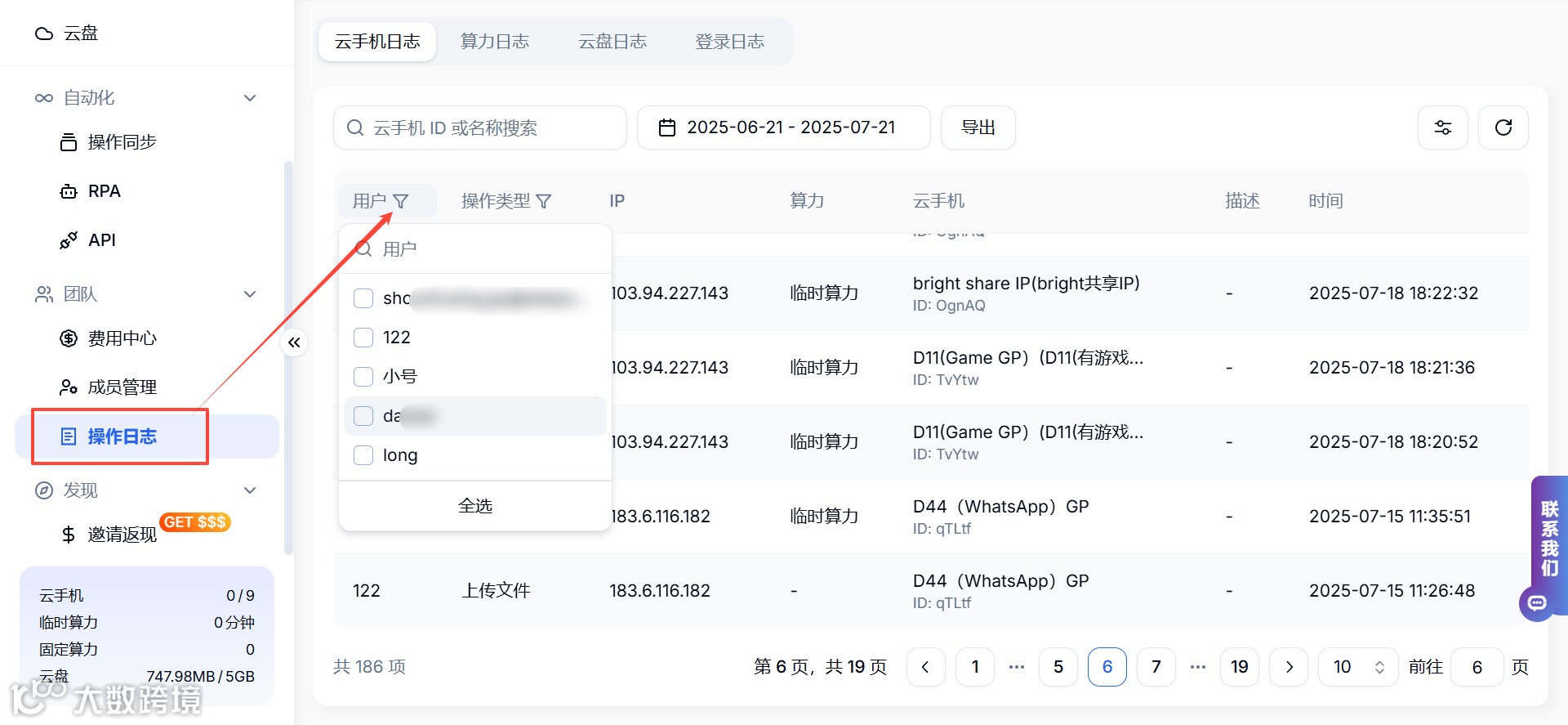DuoPlus的操作日志支持通过用户名称筛选内容,用户可以更清晰地了解团队成员所进行的操作,方便同步信息和跟踪问题。