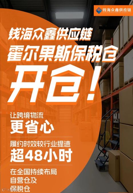 钱海众鑫供应链霍尔果斯保税仓不仅服务于中国企业开拓欧洲市场,更将成为集团在欧洲持续构建完善供应链物流体系的重要起点,进一步在欧洲市场持续构建完善的供应链物流体系,霍尔果斯保税仓的开设不仅提升了集团的服务能力,更进一步为中国的跨境卖家优化货物处理效率、强化集运仓优势,集团将充分利用霍尔果斯独特的地理位置和商贸资源,为卖家提供多元化的物流解决方案,助力拓展欧洲及国际市场,实现业务增长。