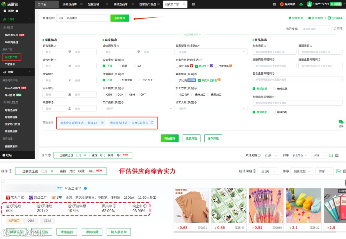 对于价格低、重量轻的学习用品等,卖家可以找专做这一业务的厂家定制打包产品,进行组合销售以提高客单价。通过店雷达找源头厂家,例如“纸品本册”类目,选择超级工厂、深度认证报告,初步筛选出主营这类产品的源头厂家,再仔细对比供应商的销售额、响应率、回头率、产品种类等,找到合适的供应商沟通谈判。