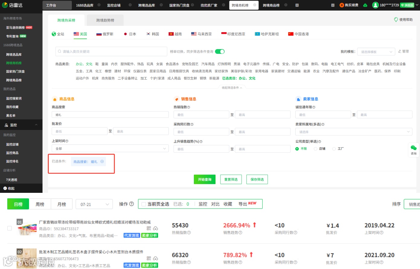 通过店雷达跨境商机榜,输入“婚礼“等关键词,从近期的热销品,找到选品灵感;此外,卖家在找相关商品时,不一定要和婚礼强关联,比如日常用的假花装饰也可以用于结婚场景,但在售卖平台(亚马逊、tk等)需要埋入场景词来达到精准营销。