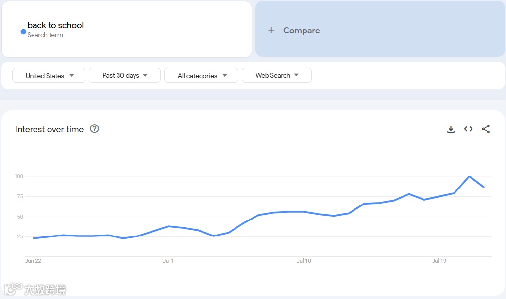 返校季是美洲、欧洲、日韩等地区的重大营销节点,特别是在美洲市场,甚至仅次于圣诞节的第二大销售旺季,从谷歌趋势上看,过去一个月内,“back to school”(返校)一词在全美范围内的搜索热度呈现持续上升趋势,需求潜力旺盛。