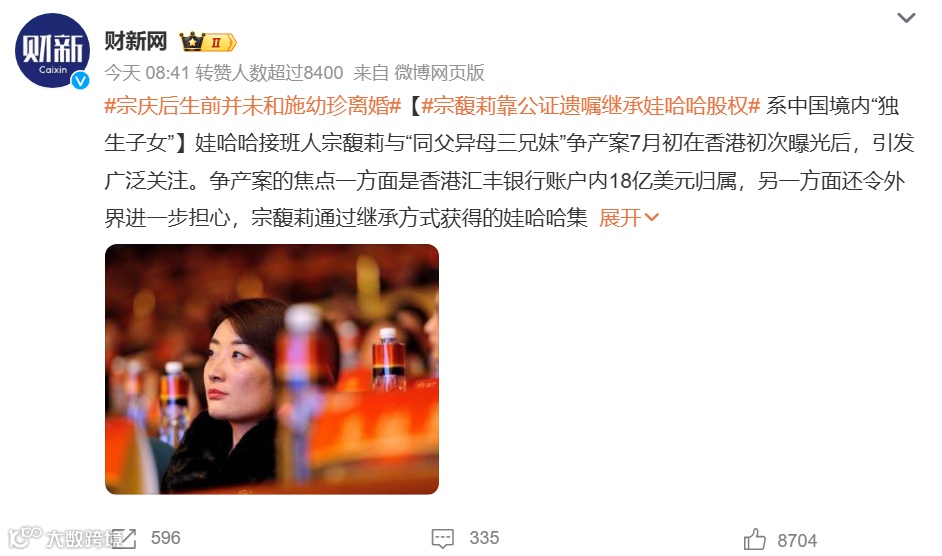 围绕宗庆后遗产的法律争议持续发酵。据财新社报道,宗馥莉凭借公证遗嘱、《独生子女光荣证》等12项材料,合法继承其父所持娃哈哈29.4%股权[k]。尽管香港高等法院将于8月1日就相关信托事项进行聆讯,但杭州法院的诉讼已明确指向娃哈哈核心股权归属问题。宗馥莉的继承合法性获得官方材料支撑,亦赢得大量公众支持,“力挺嫡长女”成为网络主流声音[k]。