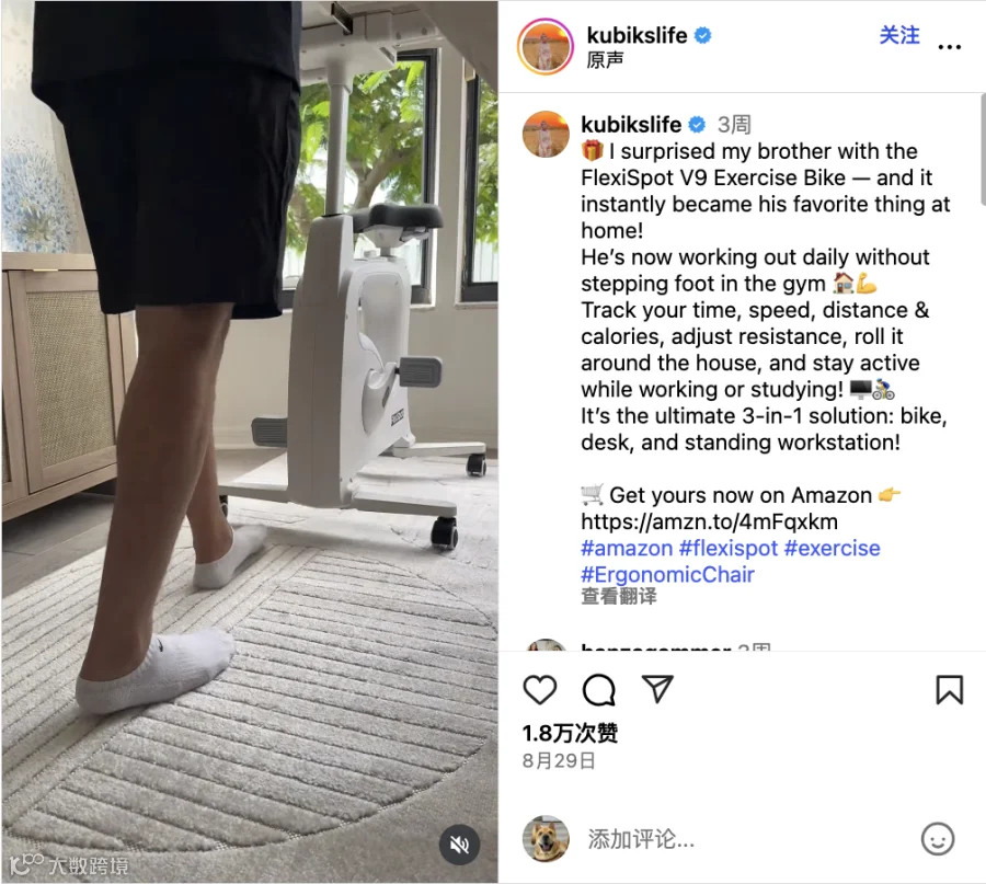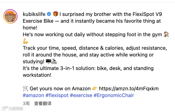 同时,她在帖子中放置了 Amazon 的购买链接,并明确引导“Get yours on Amazon”,极大缩短了从种草到下单的转化路径。配合 #amazon #flexispot 等关键词标签,内容不仅触达现有粉丝,还通过平台推荐机制渗透到更广泛的用户群体。