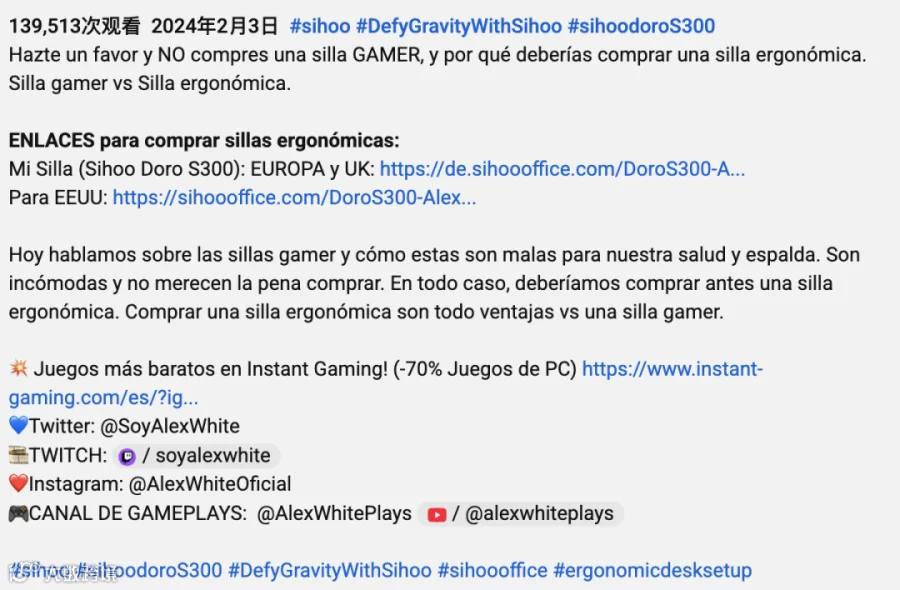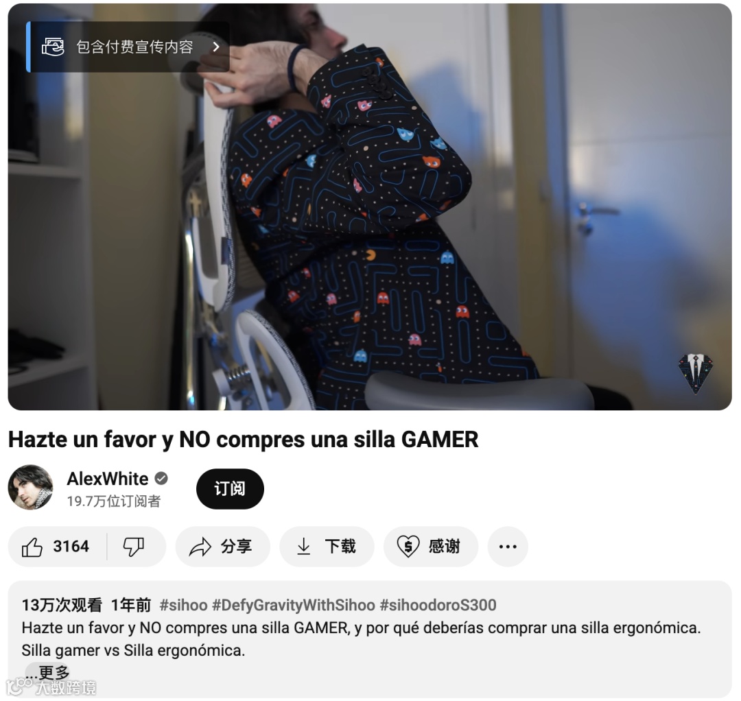 更重要的是,通过 AlexWhite 的背书,Sihoo 不仅打破了 gamer 椅的固有印象,还在目标市场建立起“专业人体工学品牌”的定位。相比传统硬广,这种基于真实体验与健康痛点的内容更容易赢得信任,形成长尾效应。