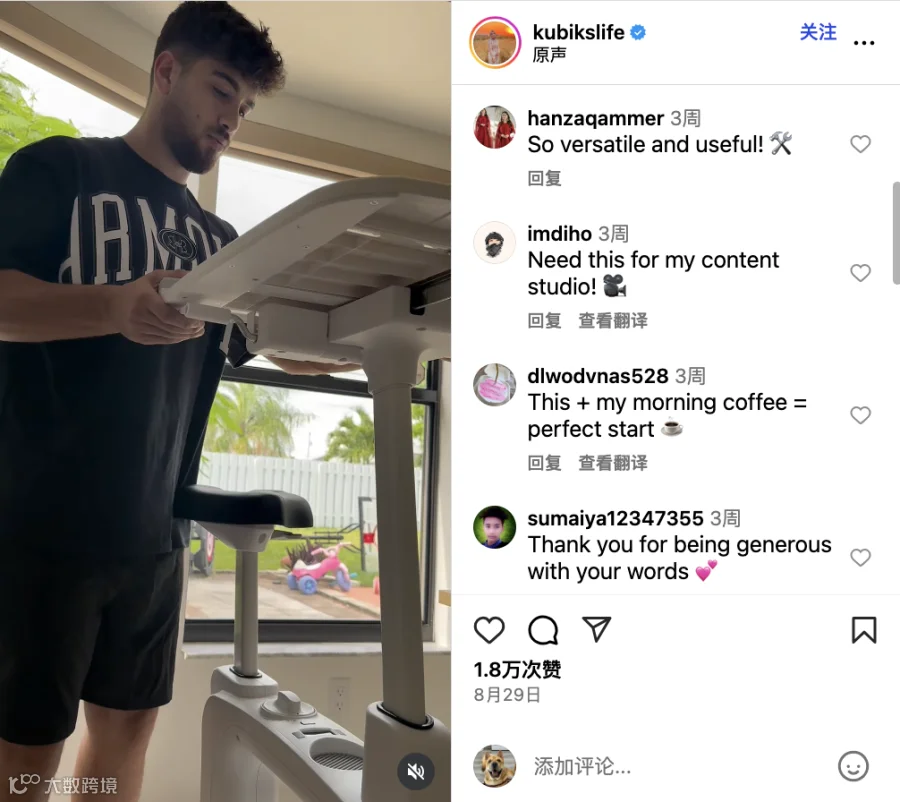 在传播方式上,kubikslife 的操作堪称教科书式。她在文案中用简洁的语言列出产品卖点:“跟踪时间、速度、距离与卡路里、可调阻力、3 合 1 的工作站”,帮助观众快速理解产品价值。
