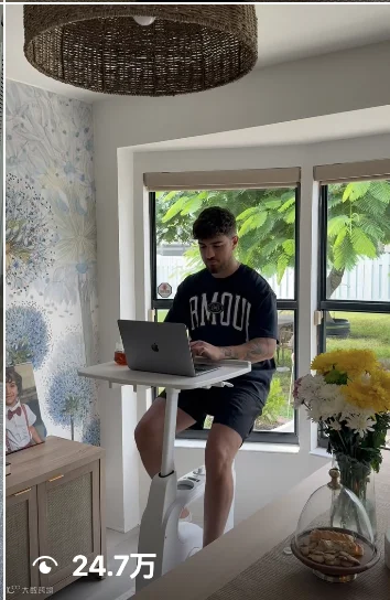 视频拍摄地点选择在温馨的家居环境,窗外绿植与书柜背景让产品与日常生活自然结合。她以“兄弟在家边办公边运动”的设定,直观展示了这款产品如何帮助用户一边工作一边健身,解决了现代人在家办公缺乏运动的痛点。