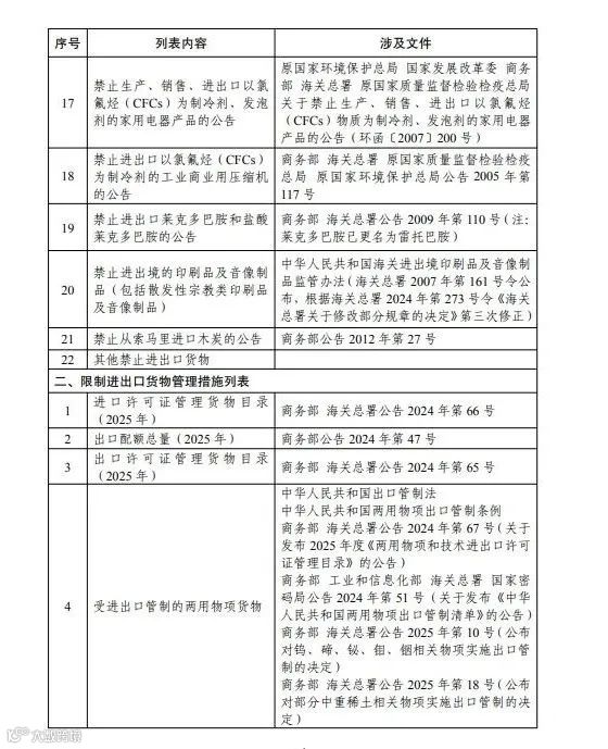 禁止、限制进出口(境)货物、物品管理措施列表