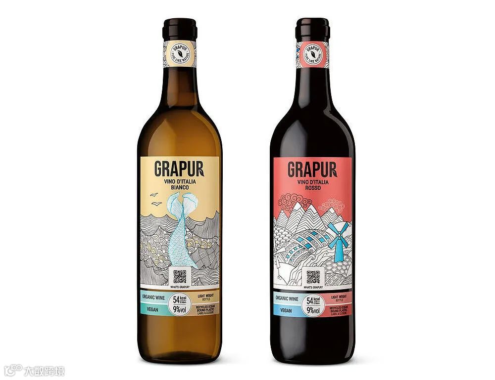 作为致力于生产环保型葡萄酒的葡萄酒项目,GRAPUR在设计酒瓶时特别强调了这些环保目标。酒标采用柔和色调,搭配自然景观插画。酒瓶颈部的封套上也印有这些图案的缩小版。酒塞和酒标均采用从海洋中回收的塑料制成,并经过再循环处理。酒瓶的轻量化设计有效降低了生产和运输过程中的碳排放。