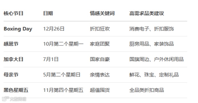 规划性: 帮助跨境卖家/采购商提前规划全年营销活动、备货周期、物流安排和促销策略,抢占加拿大节假日商机。