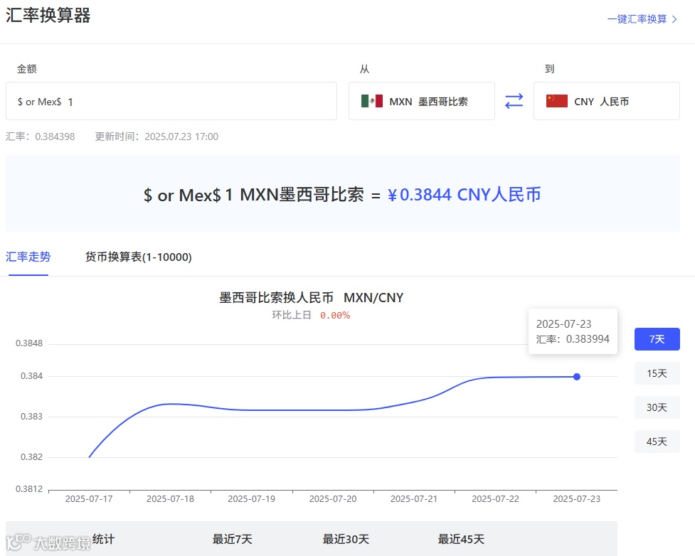 在涉及墨西哥市场时,如何准确地了解墨西哥比索(MXN)与人民币(CNY)之间的汇率变化,成为了跨境电商行业的一大挑战。大数跨境推出的专业汇率换算工具,正是为满足这一核心需求而设计,致力于为用户提供卓越的货币兑换计算体验。