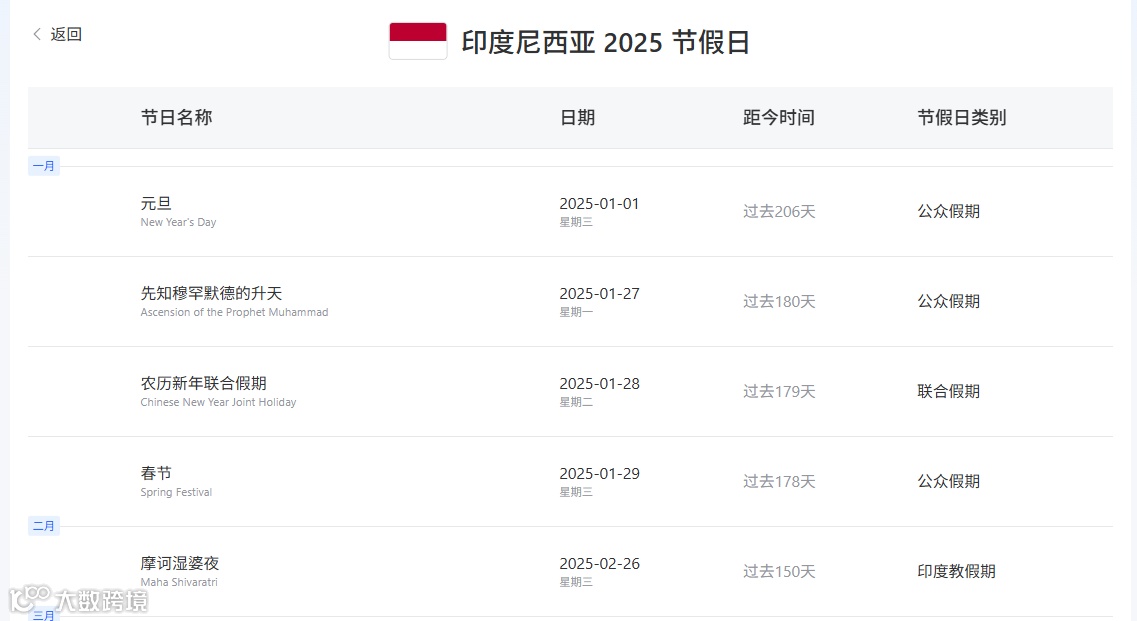 了解印尼等国家的节假日安排、消费习惯及文化禁忌,跨境电商卖家能够更有效地制定运营策略,避免节假日误差带来的损失。大数跨境世界各国/地区节假日查询工具,帮助卖家掌握全球节假日动态,把握市场机遇。