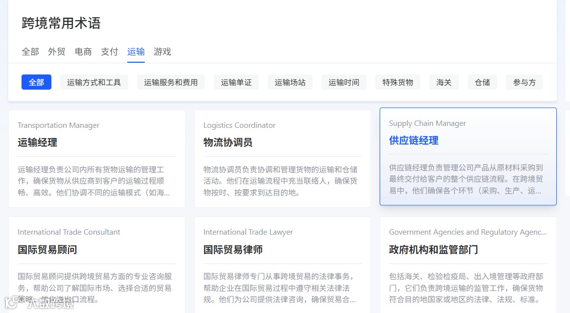 跨境电商的供应链管理对商家的成本控制至关重要,了解并掌握相关术语是提升效率、减少成本的关键。利用大数跨境常用术语查询工具,商家可以快速查找和理解这些术语,做出更加明智的决策。