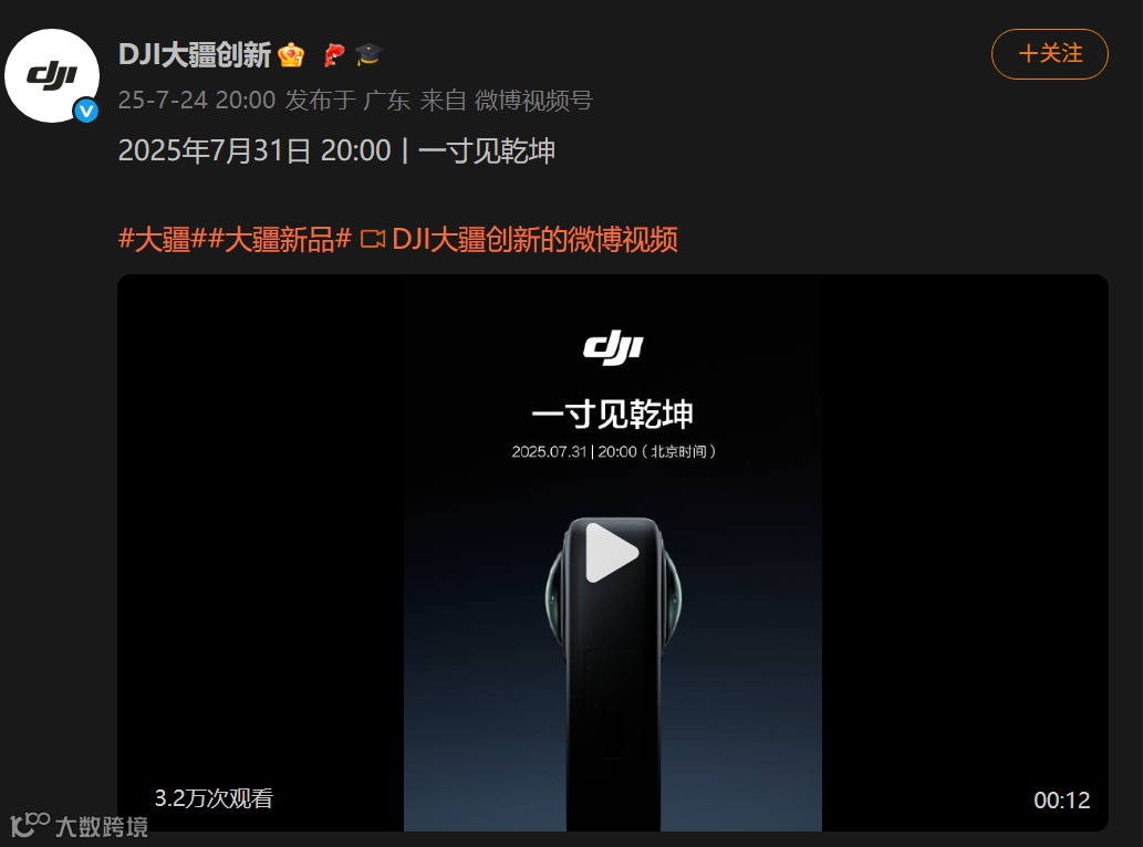 大疆已正式宣布将于7月31日发布首款360度全景相机Osmo 360,宣传语为“一寸见乾坤”,标志着其在航拍无人机、运动相机、手持相机之后,完成对智能影像全品类的布局[k]。