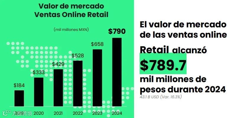 据AMVO最新报告,2024年墨西哥在线零售收入达7897亿比索(约391亿美元),同比增长20%,连续第六年保持两位数增长。电商用户规模达6720万人,渗透率高达84%,远超全球60%的平均水平[k]。