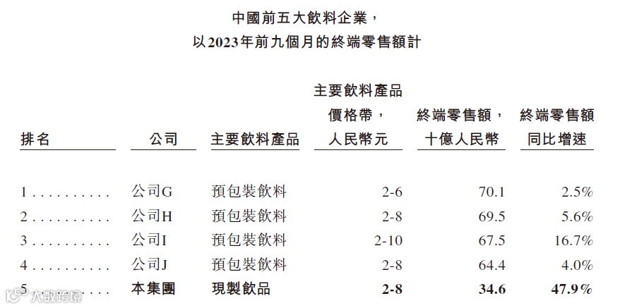 作为数据参照,未进入前五的另一家上市公司东鹏特饮,据财报披露2023年前三季度营收,也即终端零售额约为86亿元。