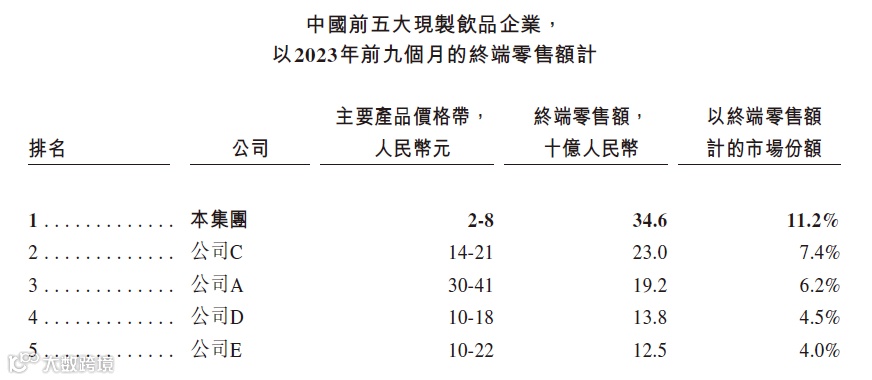 图片来源:蜜雪冰城招股书,图注:公司C是一家现磨咖啡企业,总部位于中国福建;公司A是一家在美国上市的跨国企业,总部位于美国华盛顿州西雅图市;公司D是一家现制茶饮企业,总部位于中国浙江;公司E是一家现制茶饮企业,总部位于中国四川