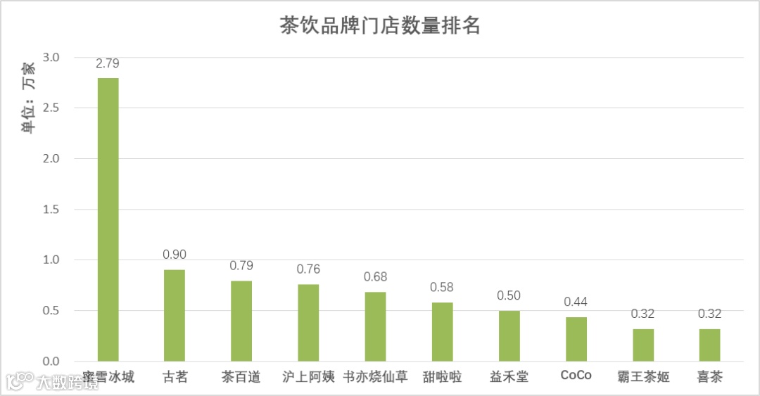 按照窄门餐眼的数据(具体数据可能与招股书及实际情况些许不同,在此只看相对排名和趋势),茶饮品牌按门店数量排名,前十名的顺序为蜜雪冰城(27920家)、古茗(9028家)、茶百道(7939家)、沪上阿姨(7613家)、书亦烧仙草(6843家)、甜啦啦(5789家)、益禾堂(4965家)、CoCo(4356家)、霸王茶姬(3200家)、喜茶(3197家)。