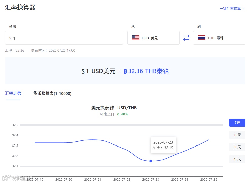 - 泰铢金额 (THB) = 美元金额 (USD) × 当前美元兑泰铢汇率
