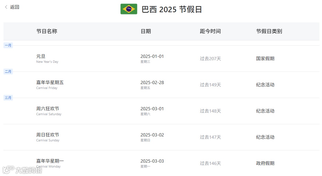 跨境电商卖家在进入巴西市场时,了解并利用大数跨境世界各国/地区节假日查询工具,将极大提升他们的市场应对能力和销售业绩。