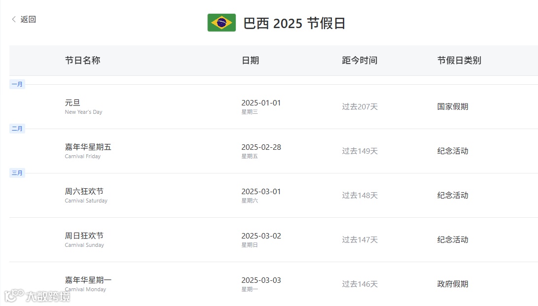 巴西节假日消费市场充满机会,但商家需要准确掌握节假日的安排和消费趋势,才能有效抓住这些机会。大数跨境节假日查询工具正是帮助商家了解全球节假日信息、调整策略、提升销量的有力助手。