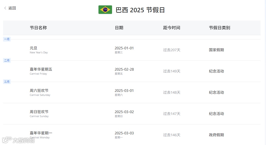 通过了解巴西节假日的消费趋势,跨境电商可以提前布局,精准卡位,抓住销售高峰。大数跨境网站提供的节假日查询工具,帮助商家获取最新的节假日信息,从而更有效地优化营销策略,提升销量。