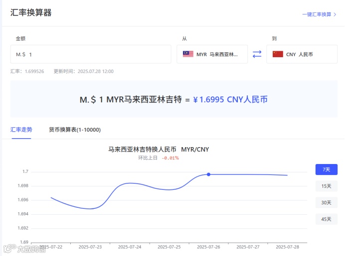 M.$1MYR马来西亚林吉特=¥1.6995CNY人民币