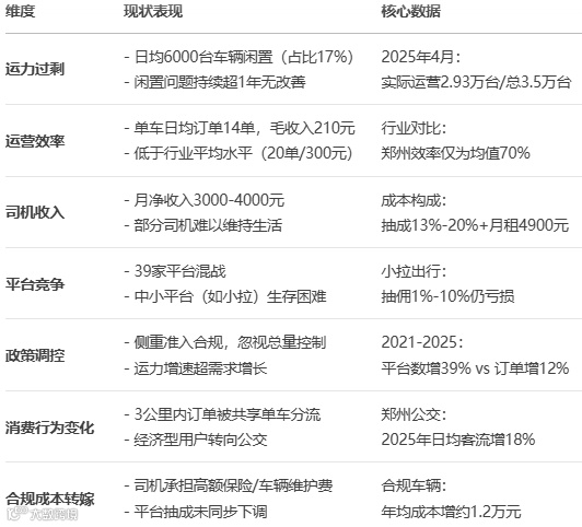 首先,政策调控滞后于市场发展。尽管郑州市从2021年开始推进网约车合规化进程,但政策主要集中在准入标准和合规要求上,缺乏对运力总量的有效调控。在"适度有序发展"的政策框架下,平台数量和运力规模快速增长,而市场需求增长相对有限,导致供需失衡。