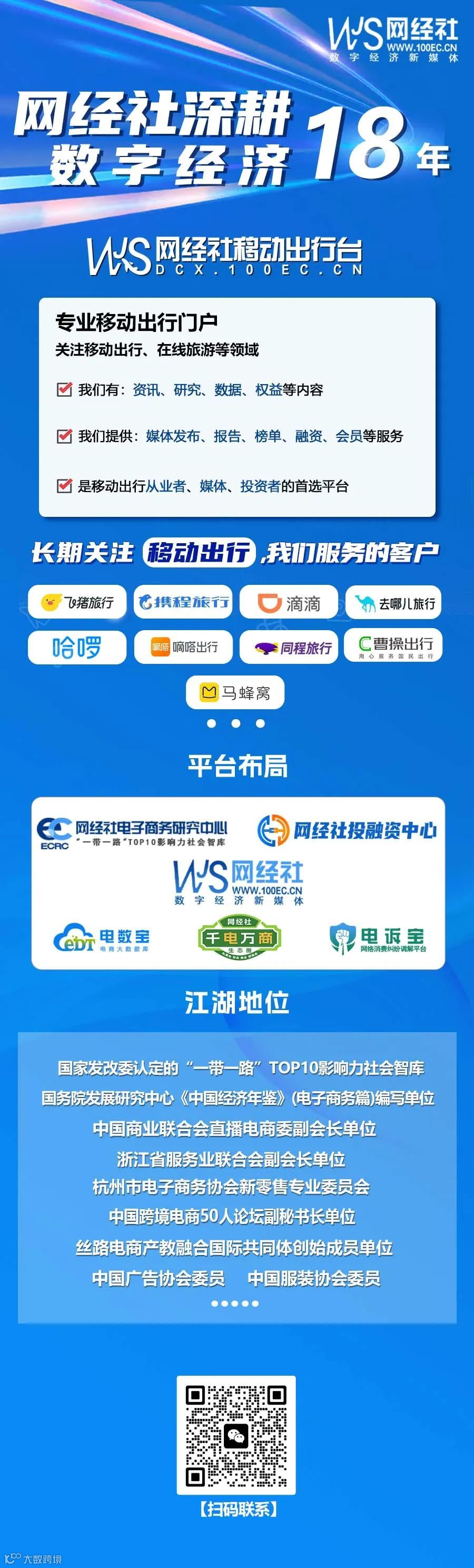 网经社移动出行台(DCX.100EC.CN)是专业移动出行门户,重点关注在线旅游、酒店民宿、网约车、共享单车、共享汽车、顺风车、代驾、等业态。提供媒体发布、报告榜单、融资、会员等服务,是移动出行从业者、媒体、投资者、用户的首选平台。[k]