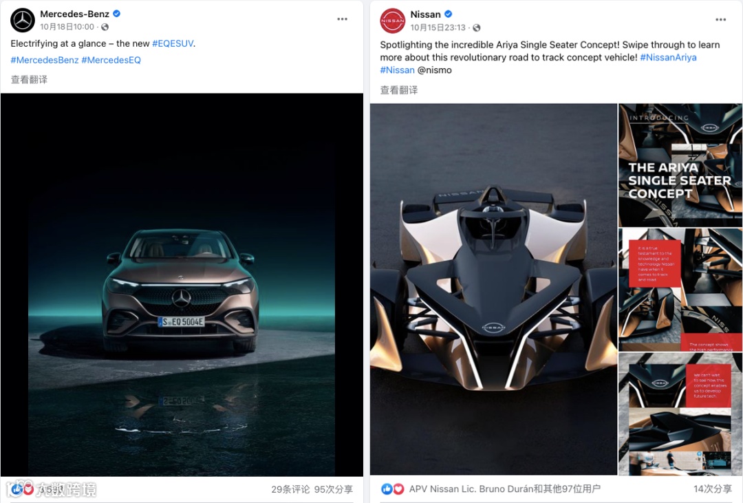 Mercedes-Benz与Nissan都是汽车品牌,在Facebook上的粉丝数分别为2277万和2200万,粉丝数相当。在都没有进行付费推广,素材内容及质量类似的情况下,下面两条帖文的点赞和分享数却表现出很大差距,这在某种程度上体现出的是受众喜好的差异: