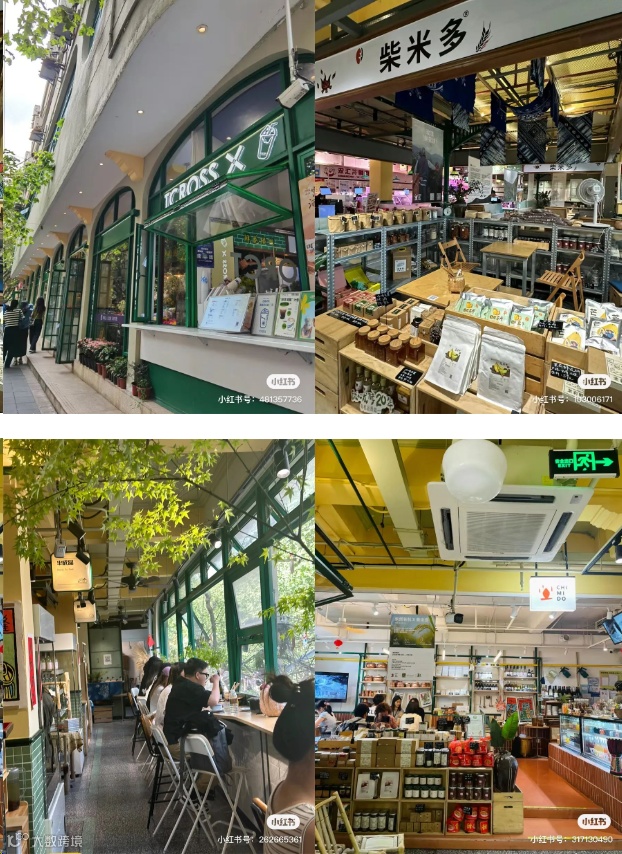 它显然更干净、又有点小精致,墨绿色的门头和台阶增加了一点文艺感,临街卖小吃的档口和菜摊肉摊都明亮清新。有这种高水准的运营基础,再去做内容的加法,才能让所有人都感到舒适。