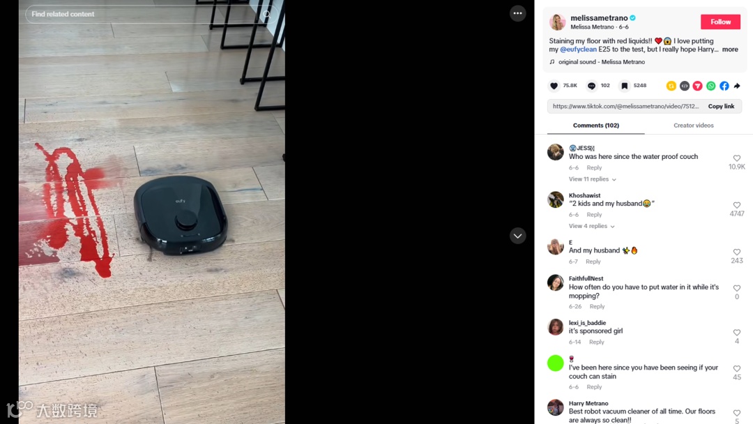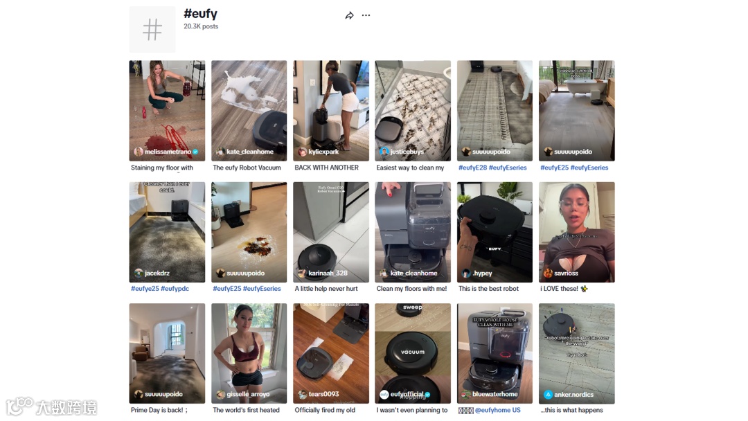 在TikTok的短视频方面,eufy通过与大量生活达人合作,发布贴近家庭日常的内容来展示产品优势。比如妈妈们细致分享吸尘器如何轻松清理洒落的食物残渣;养宠物的达人则重点展示扫地机器人如何高效清理地上的宠物毛发;还有达人通过对比视频,讲解产品的分区管理技术的实用性。
