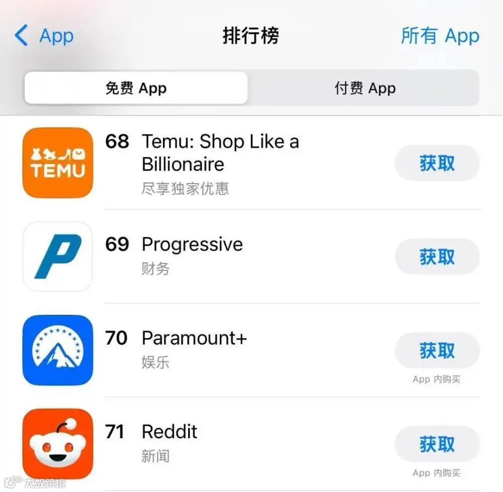 今年4月美国取消小额免税政策后,部分中国商品关税飙升至145%,迫使Temu大幅削减在美广告投放。这一调整导致其市场能见度骤降,App Store购物类应用排名从原先的前十迅速滑落至第68位。