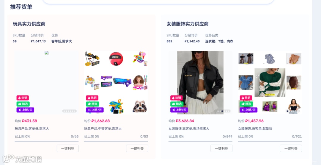 卖家只需轻松绑定店铺,通过选品中心,就能像在超市购物一样,快速筛选出适合自己店铺的爆款好货。而且,我们还支持一键刊登功能,只需简单几步操作,商品就能迅速上架到你的店铺,大大节省了你的时间和精力。要知道,在竞争激烈的跨境市场中,时间就是金钱,效率就是生命!