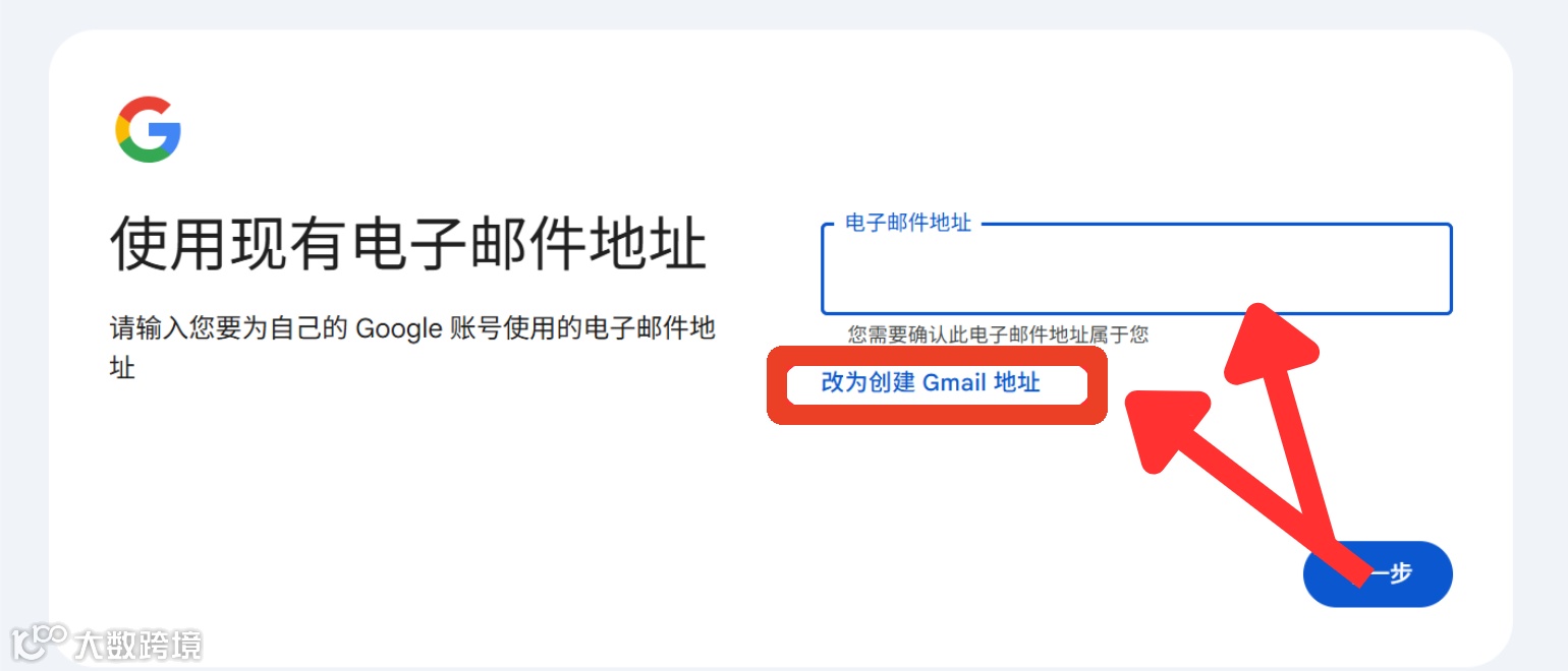 ⑤ 填入一个目前正在使用的邮/箱地址,接收谷歌发送至邮箱的邮件,完成邮箱验证。