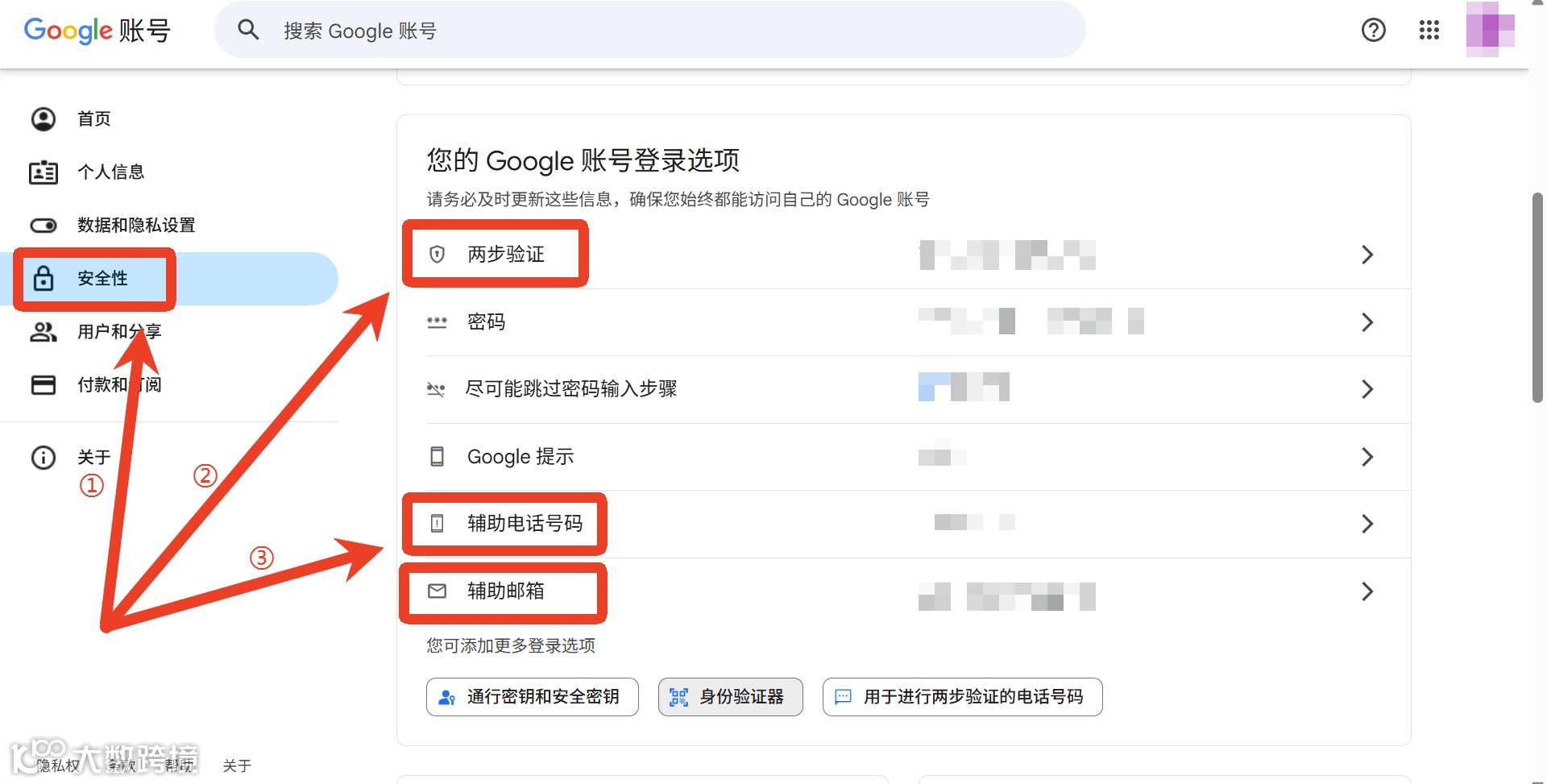 ②点击 [安全性] ,在该页面中设置“两步验证”、“辅助电话”和“辅助邮箱”。