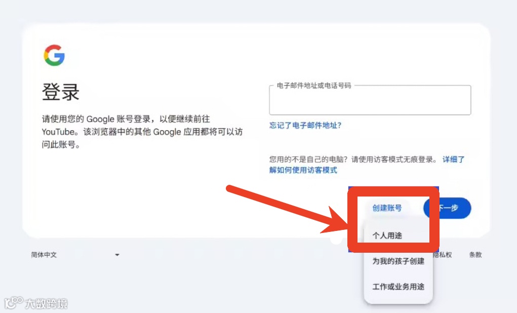 ② 点击 [创建账号],并选择 [个人用途] ,进入创建谷歌账号流程。