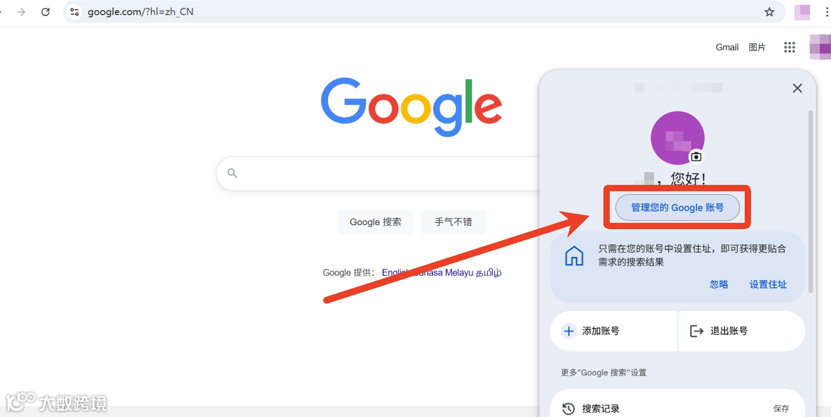 ①注册完成后,点击头像进入 [管理您的 Google 账号] 页面。