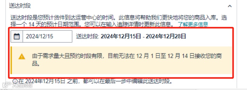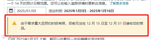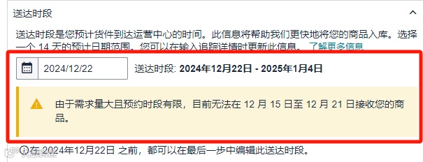 根据官方信息,亚马逊将于2024年12月15日至12月31日期间暂停接收新货件入库[k]。