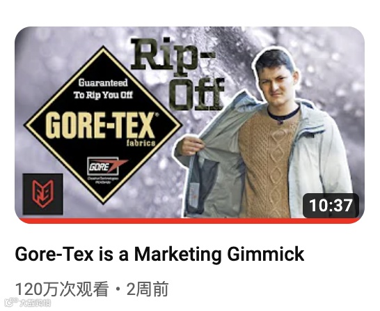 两周前,油管大神发布了一条视频爆锤 Gore-tex 营销骗局,讲述品牌如何神化 Gore-tex 特性,混淆透湿和透气这两大相悖概念。