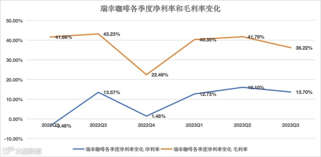 不过持续性的价格补贴也稀释了瑞幸的利润率。三季度瑞幸的毛利率环比二季度下滑了5%,在营收大涨85%的情况下,净利润不升反降,利润率也从二季度的16%下滑到了13.7%。