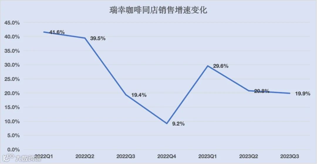 另一个被外界关注的指标——同店销售增速在Q3也有所放缓。虽然总体增速仍然有20%,但如果剔除过去一年的新增门店,单店来看,三季度这一数字同比下滑了6%。
