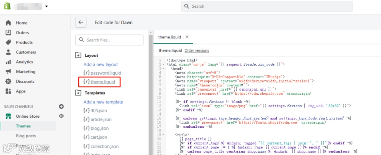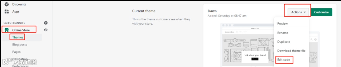 8.打开shopify店铺后台,online store>themes>actions>edit code