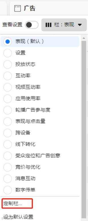 10.在“广告系列”、“广告组”或“广告”,均可点击栏:表现,找到设置的定制栏。方便查看数据