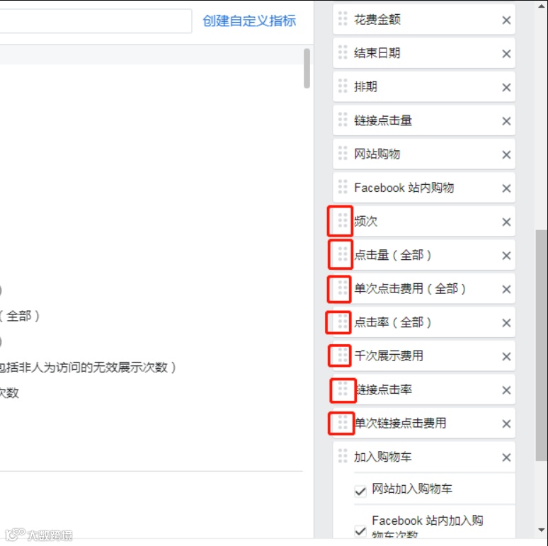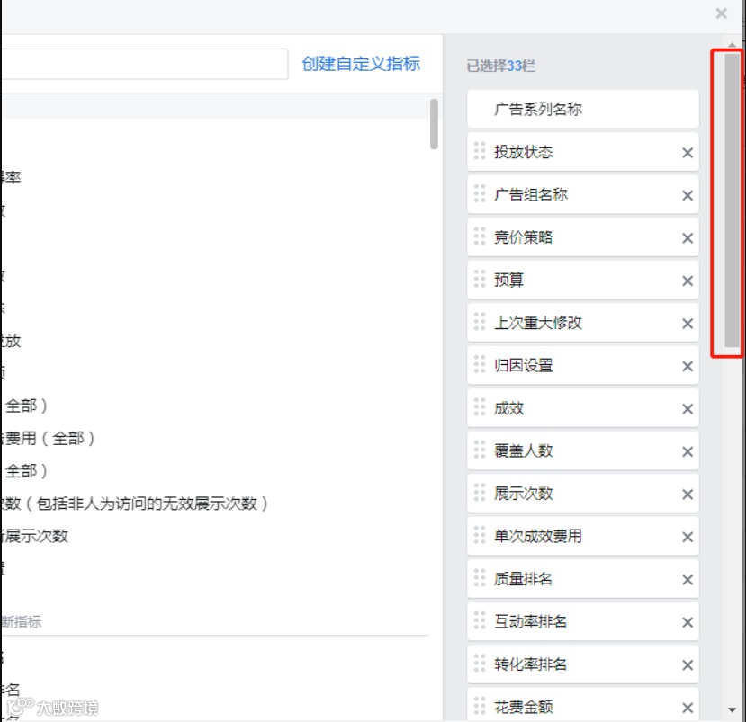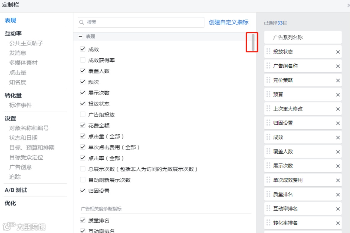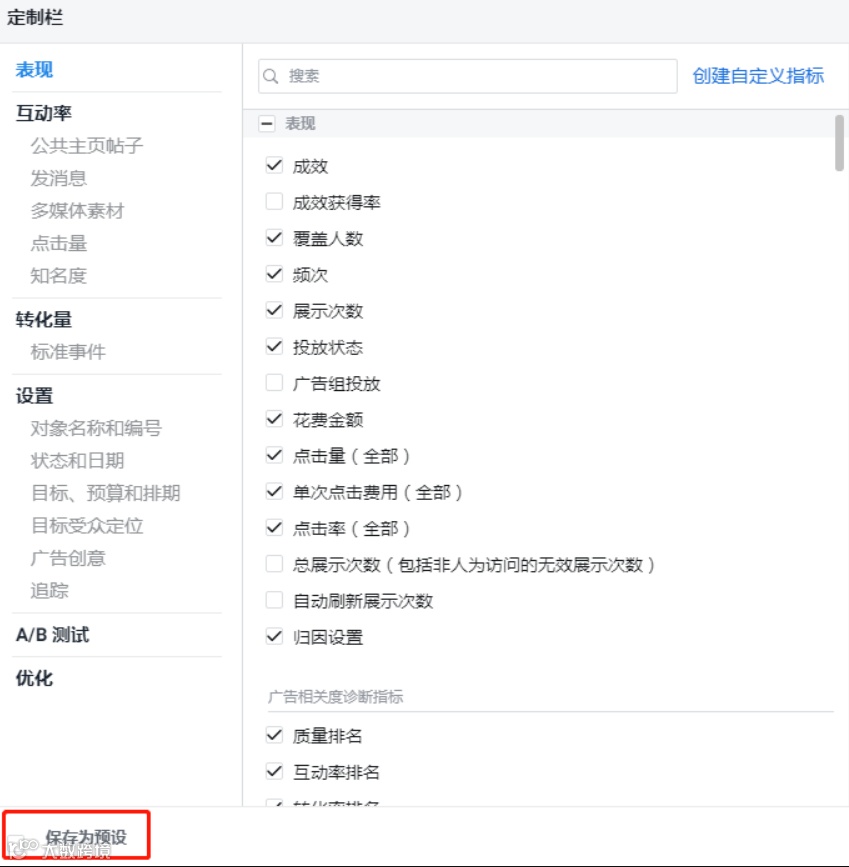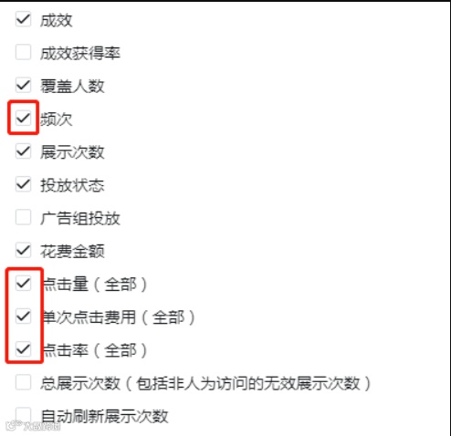3.选择想在表中添加的指标。系统将针对您选择的指标自动显示相关渠道的细分数据。常用的有:成效、覆盖人数、展示次数、投放状态、预算、频次、点击量(全部)、单次点击费用(全部)、点击率(全部)、花费金额、单次成效费用、千次展示费用、链接点击量、链接点击率、单次链接点击费用、帖子评论、加入购物车次数、发起结账、购物、广告花费回报(ROAS)、质量排名、互动率排名、转化率排名等等这些,可根据自己商业模式(B2B/B2C)或投放素材(图片/视频)的需求自行添加,不同类型不同素材,参考的指标也不同。
